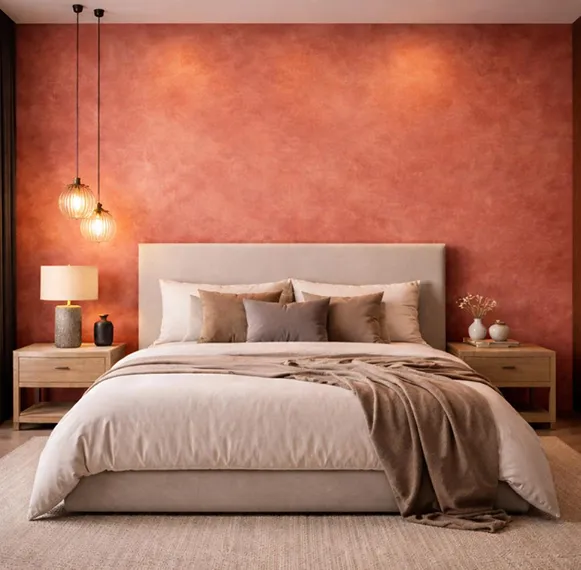Diferente do cimento queimado fosco, o Perolizado contém cargas minerais especiais que refletem a luz suavemente. O resultado é uma parede com aspecto de seda ou veludo, muito usada em cabeceiras de cama e salas de estar de alto padrão.